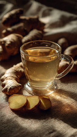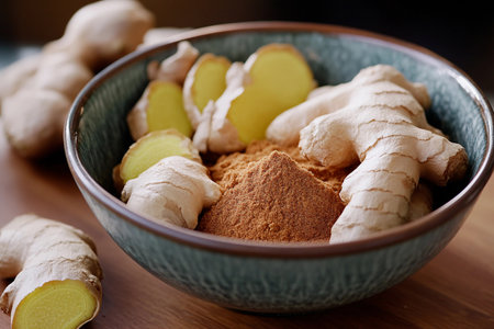 A vibrant display of fresh ginger roots, both whole and sliced, is complemented by a mound of ground ginger in a textured bowl. The warm, earthy tones create a cozy feel in the kitchen setting.