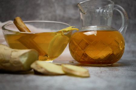 preparation of a ginger and cinnamon infusion with fresh produce natural roots and cinnamon stick served in a pitcher and a cup