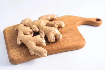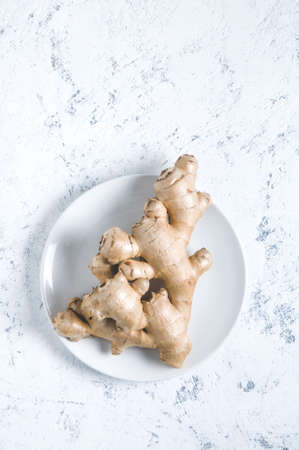 Freshness raw ginger on white background . Vegetable or ingredient in asia culinary ,spicy test ,growing in soil. top view, flat lay.