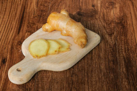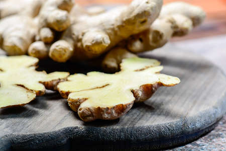 Fresh ginger on wooden background, herb medical concept. Ginger root on wooden table. Macro photo