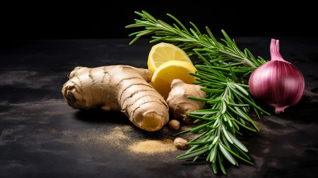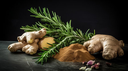 freshly cut ginger, surrounded by fragrant rosemary, aromatic spices, and thinly sliced onion, rests on a rustic dark stone background, evoking a sense of earthy elegance and culinary sophistication, perfect for cooking up a storm in the kitchen. ai generated