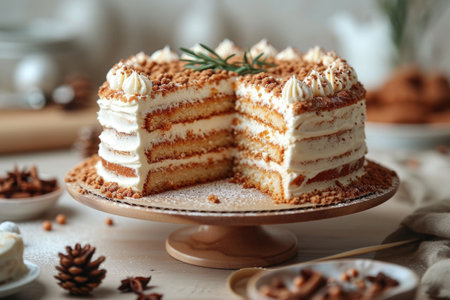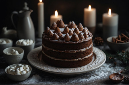 A delectable festive cake adorned with charming Christmas decorations, set against a warm and inviting background, perfect for celebrations and gatherings.