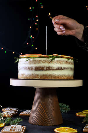 Beautiful delicious cake with sprigs of rosemary and orange frips. New Years dessert. Biscuit cakes, gingerbread.