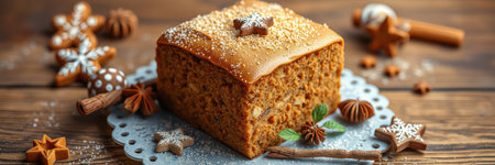 Delicious gingerbread cake displayed on lace doily with festive decorations for holiday celebrations