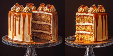 Delicious caramel cake with layers, topped with frosting and caramel drizzle in a simple elegant setup