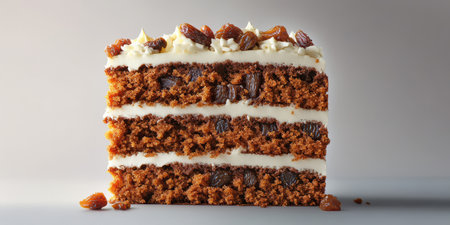 Deliciously layered carrot cake with cream cheese frosting displayed on a simple background