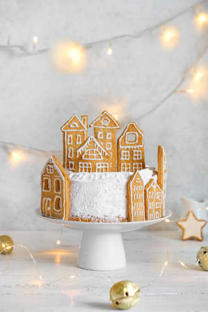 Christmas cake decorated with gingerbread cookies in shape of village houses, copy space. White Festive Cake with Christmas decor and garlands for winter holidays.