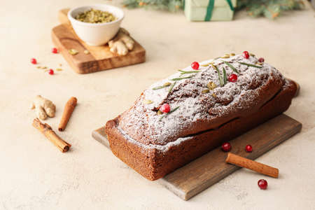 Board with tasty gingerbread cake on light background