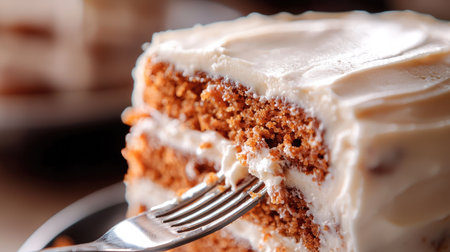 A close-up view of a delicious slice of cake topped with creamy frosting, showcasing texture and indulgence perfect for dessert lovers and celebrations.