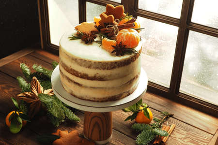 A tall cake on a stand near the glowing window on the windowsill, tangerines, cookies and fir branches.