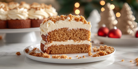 Gingerbread Cake Slice with Cream Cheese Frosting and Crumb Topping on Plate, Festive Background