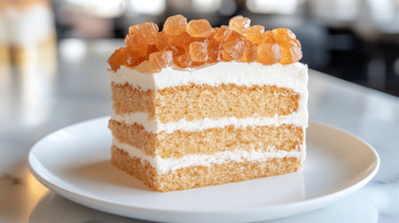 Spice Cake Slice with Cream Frosting and Ginger Candy on White Plate for the Holidays