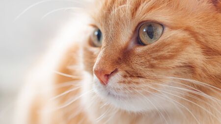 Muzzle of a red tabby cat close-up. A beautiful furry pet.