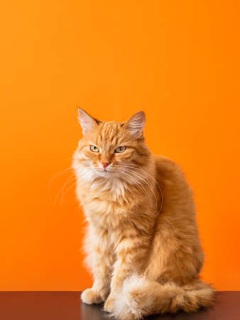 Cute ginger cat on bright orange background. Portrait of proud fluffy pet. Furry domestic cat.