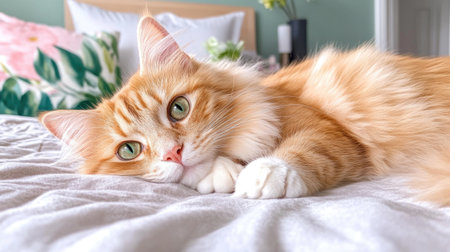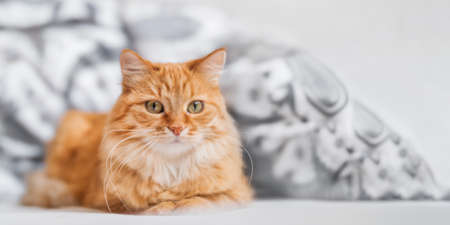 Beautiful ginger cat lying on the bed. Fluffy pet.
