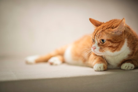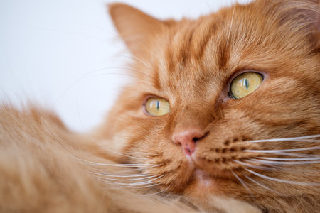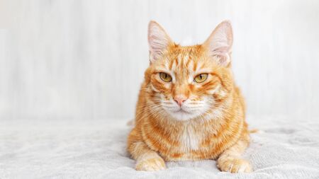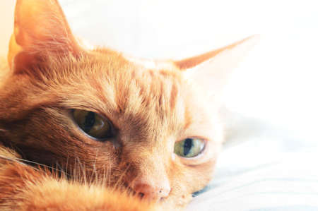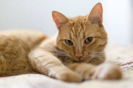 Closeup portrait of red cat lying on a bed against white blurred background. Shallow focus.