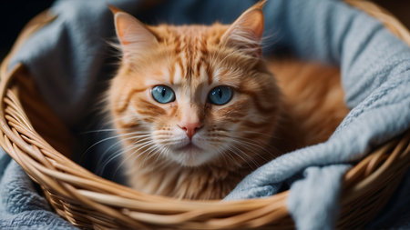 Cute little ginger cat laying in a gray blanket at home, relax time