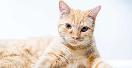 Orange cat. Portrait of tabby ginger cat over white background. Adorable pet posing at studio. Cute domestic animal.