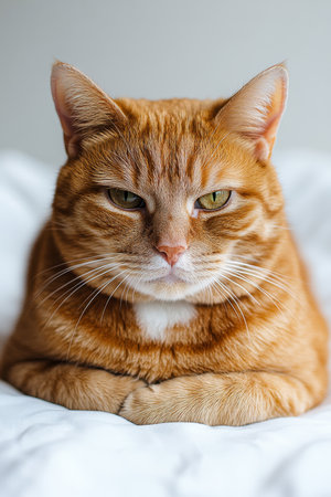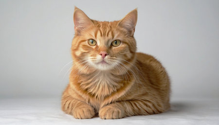 Elegant Ginger Tabby Cat Sitting Comfortably with Crossed Paws in a Soft Focus White Scene