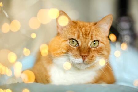 Close-up of the cat's face.The red cat looks at the camera with green eyes. yellow round bokeh.Christmas cat