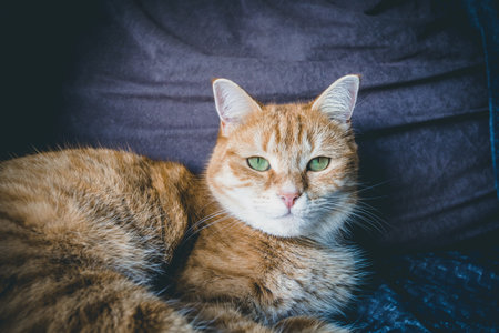 Cute red cat lying on the sofa and looking at the camera