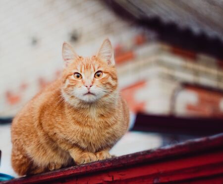 Portrait of a village red-haired cat on a fence.Domestic clean kitty on the old wooden fence.Vintage photo of a gentle beautiful white kitten