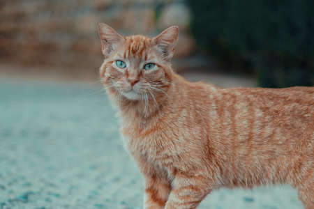 cute orange cat with green eyes furry feline close-up, city and friends.