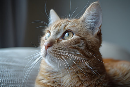 red cat looking up carefully on a grey background.