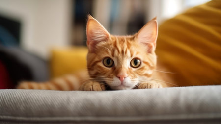 Cute ginger kitten lying on the sofa at home and looking at camera