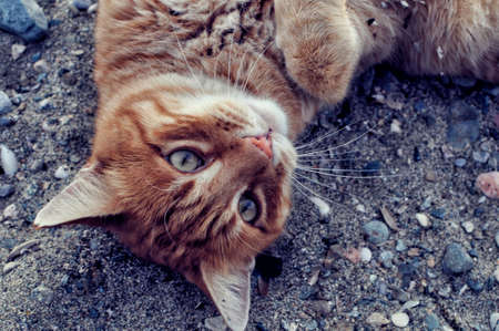 Ginger tabby cat lying on its back outdoors in garden in nature. Pet Close-up.