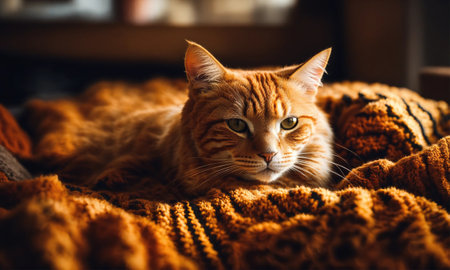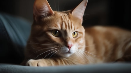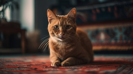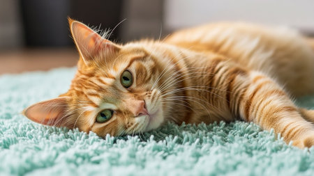 Cute ginger cat lying on the carpet and looking at the camera.generative ai