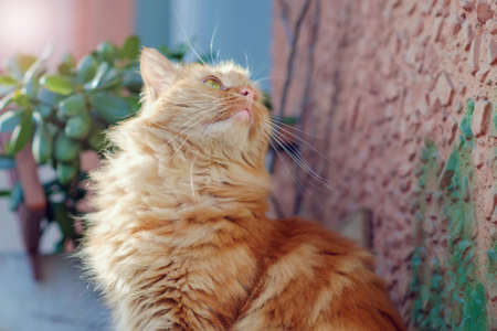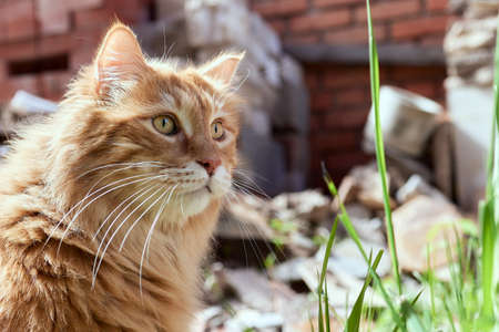 Beautiful red cat on the lawn. Portrait of a cat close-up.