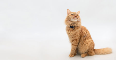Ginger cute cat looking curiously on white background. Copyspace for your text. Adorable home pet stock photo