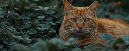 Behold a serene vision of feline grace amidst verdant splendor A breathtaking orange cat reclines gracefully among lush foliage, its emerald-green surroundings mirroring its calm demeanor This captivating image captures the harmonious connection between nature and animal, inviting viewers to find solace in the tranquility of the moment AI Generative
