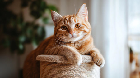 An adorable cat sitting atop a scratching post, looking regal and content in its high perch.