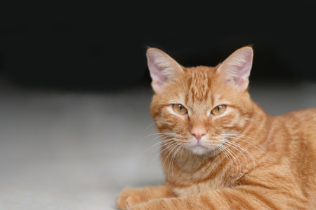close up one brown tabby cat lying on ground. Looking at camera. Blur dark copy space