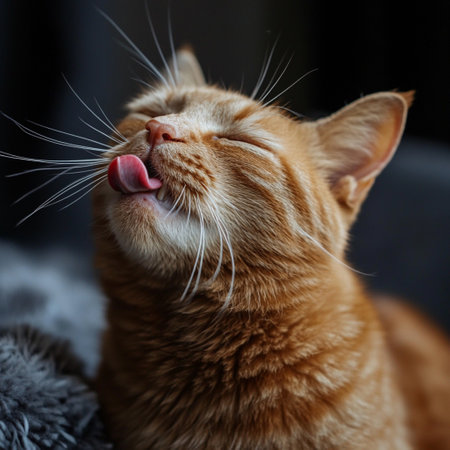 A content ginger cat savors a delightful moment by licking its nose in a cozy, dimly lit room.