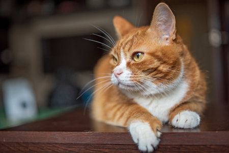 Yellow male adult cat watching the camera while lying at side table