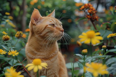 Featuring a this cat is in the garden with a yellow flower, high quality, high resolution