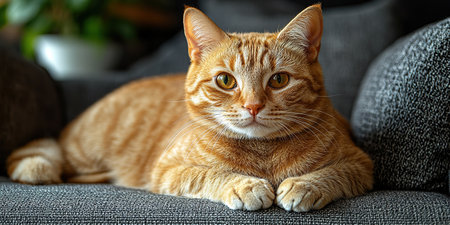 Cute ginger cat sitting on sofa in living room at home.