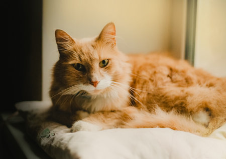 Portrait of a cute beautiful ginger cat lying on the windowsill on a pillow on a bright day. A pet.