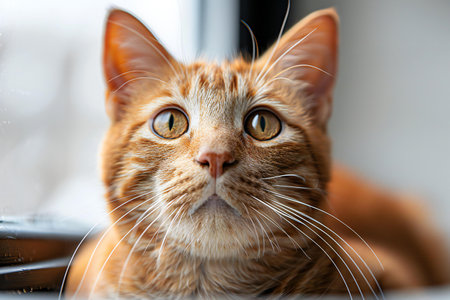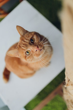 Funny ginger cat looking at the camera. Cat at home, funny animals. Copy space