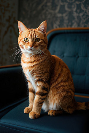 Beautiful ginger cat sitting on a sofa in the room