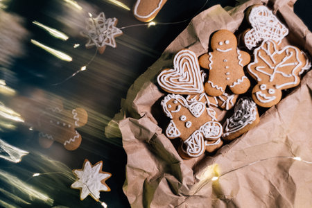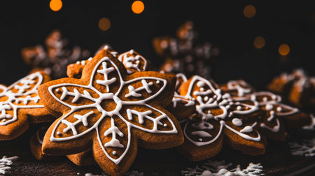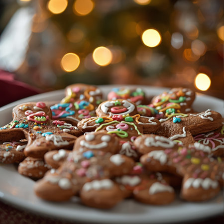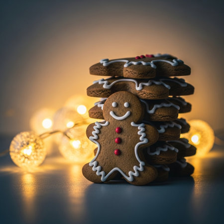 Delight in a charming scene of gingerbread cookies adorned with icing, surrounded by twinkling festive lights, evoking warmth and joy of the holiday season.