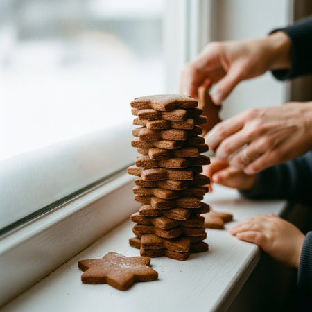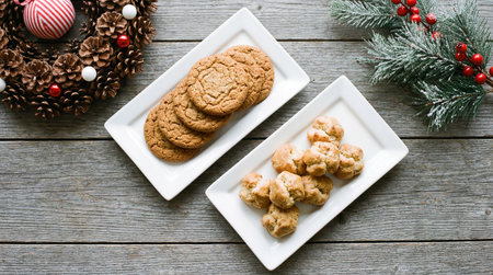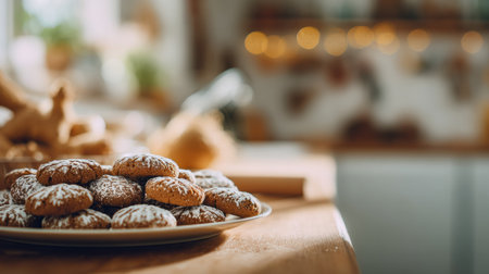 Freshly baked cookies are beautifully arranged on a plate in a inviting kitchen, creating a warm atmosphere perfect for the festive season.