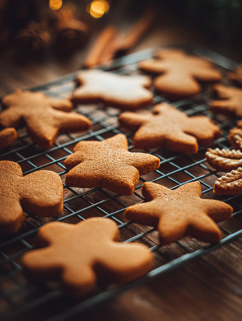 Freshly baked gingerbread cookies in various shapes on a cooling rack, surrounded by warm holiday lights, creating a festive atmosphere.