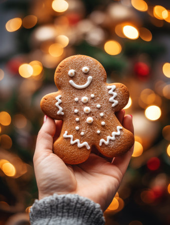 Hand holding gingerbread man with festive background.