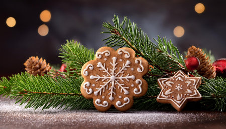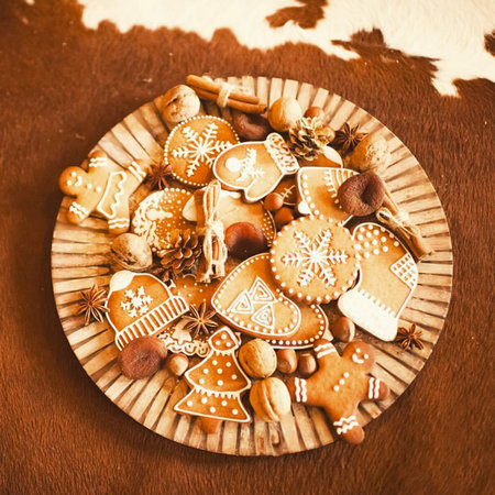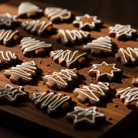 Festive holiday cookies decorated with icing on a rustic wooden table during winter celebrations