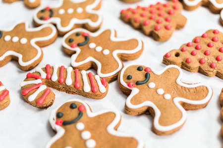 Decorating traditional gingerbread cookies with royal icing for Christmas.