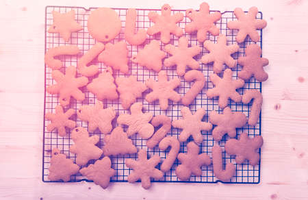 Fresh baked and prepared Christmas shaped gingerbread cookies placed on steel grill frame on a table. View from above.